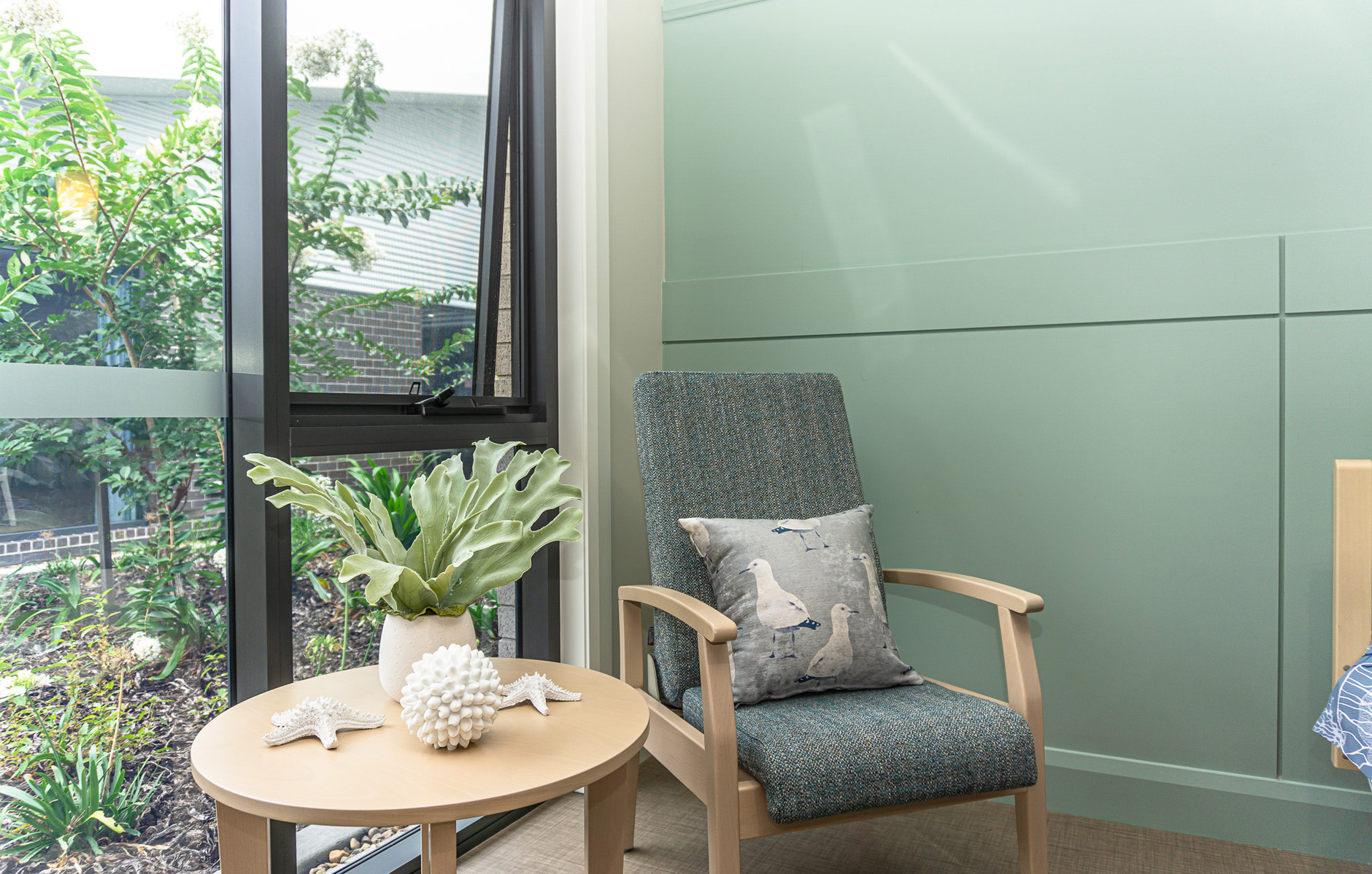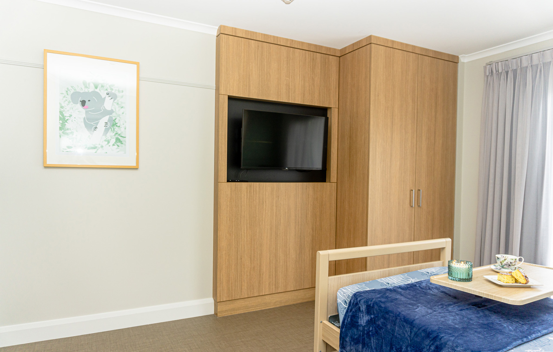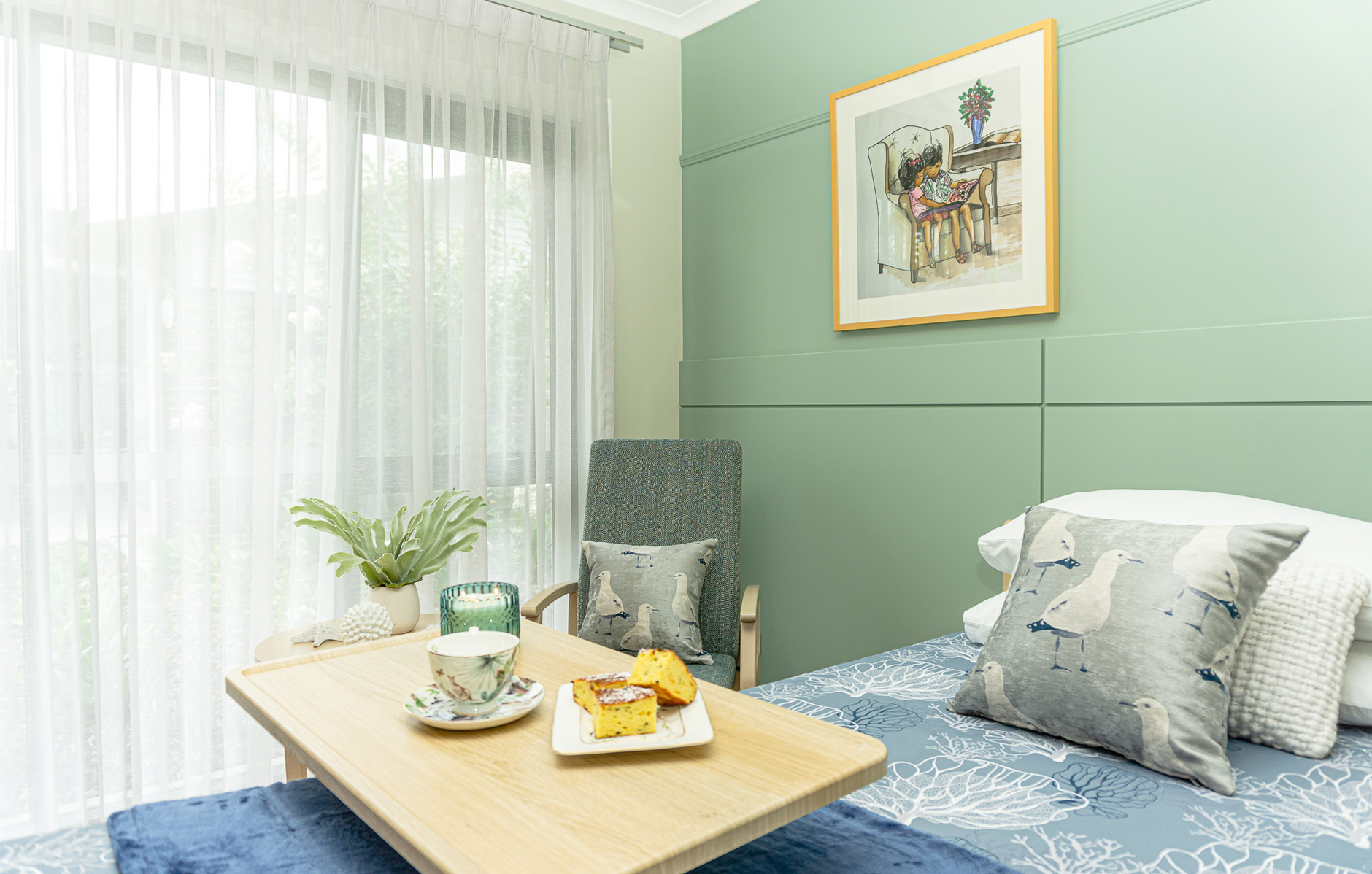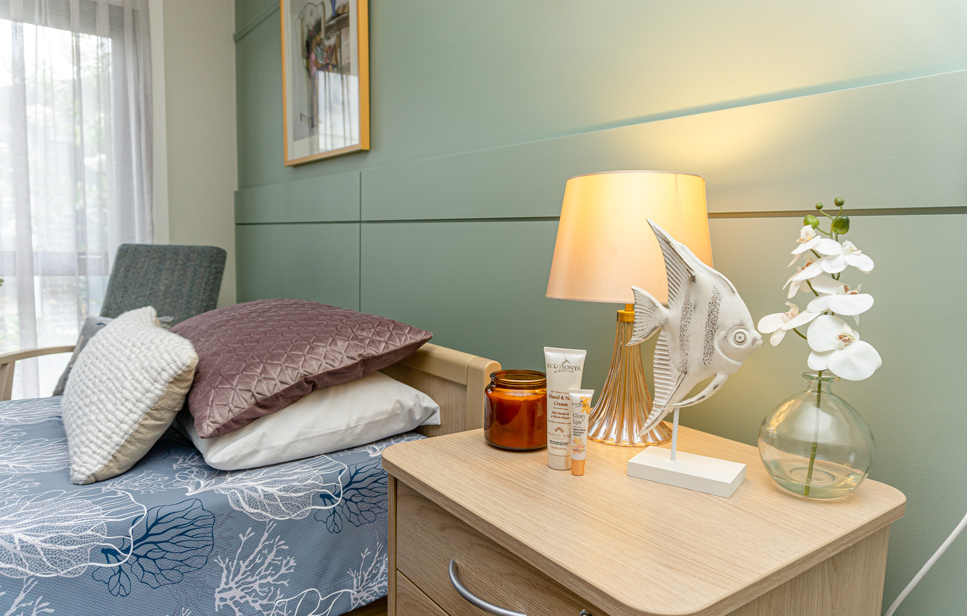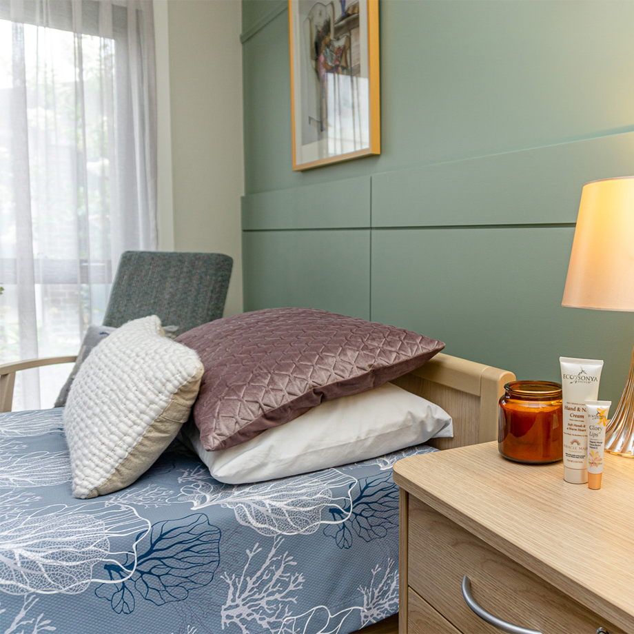 Your room will be fitted with essential furniture, such as appropriate bed and bedding, bedside table, wardrobe/drawers, armchairs and toiletries. We encourage you to personalise your room with small items like photos or keepsakes. You may wish to bring some small pieces of furniture such as a favourite chair.